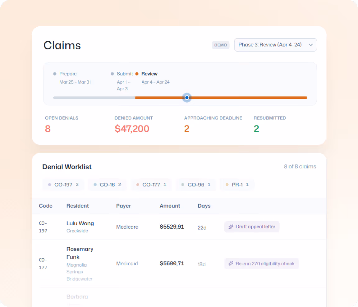 See what’s submitted, pending, denied, or paid across every community. Leaders finally have confidence in forecasting and reporting, with clear next steps.