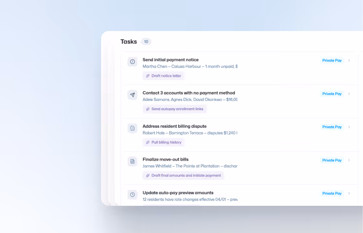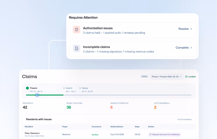 Sunbound addresses the core financial and operational inefficiencies in senior living, including unpredictable cash flow, high bad debt, and complex claims denials. Beyond finance, we solve operational challenges by automating manual workflows for reconciliation, move-ins, and move-outs, reducing administrative burden and giving staff time back for resident care. With Sunbound, operators typically see: