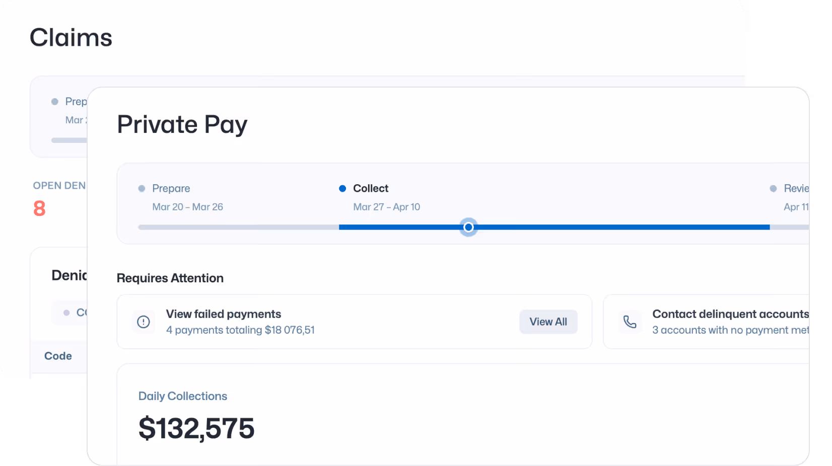 Paper checks, variable claim cycles, and inconsistent community follow-up make cash flow nearly impossible to forecast. Bring predictability and consistency to every dollar coming in, across private pay and claims, so you can operate with confidence.