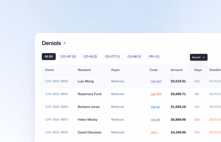 From PDPM shifts in Skilled Nursing to state-specific Medicaid waivers in Assisted Living, keeping up with payer rules is a full-time job. One wrong code triggers a denial that takes weeks or months to catch and fix.