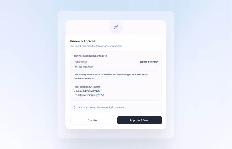 Tally final charges and apply deposits instantly when a resident moves out. Issue net refunds or final balances instantly, providing a graceful exit for every family.
