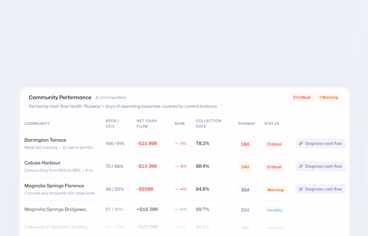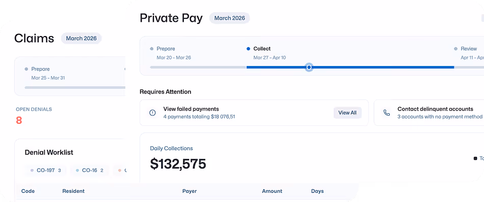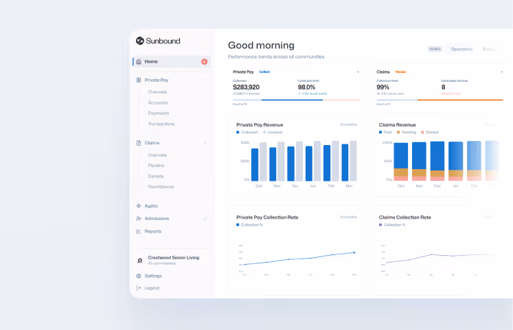 Sunbound provides Senior Living CFOs with a unified Revenue Operating System that eliminates the latency between "Service Delivered" and "Cash Collected." By automating private pay collections and scrubbing claims pre-submission to ensure eligibility, we reduce Days Sales Outstanding (DSO) and provide real-time visibility into portfolio-wide financial health, allowing finance leaders to forecast with precision rather than guesswork. Cash flow becomes predictable and senior living operators can focus on the investments needed to improve care for their residents.